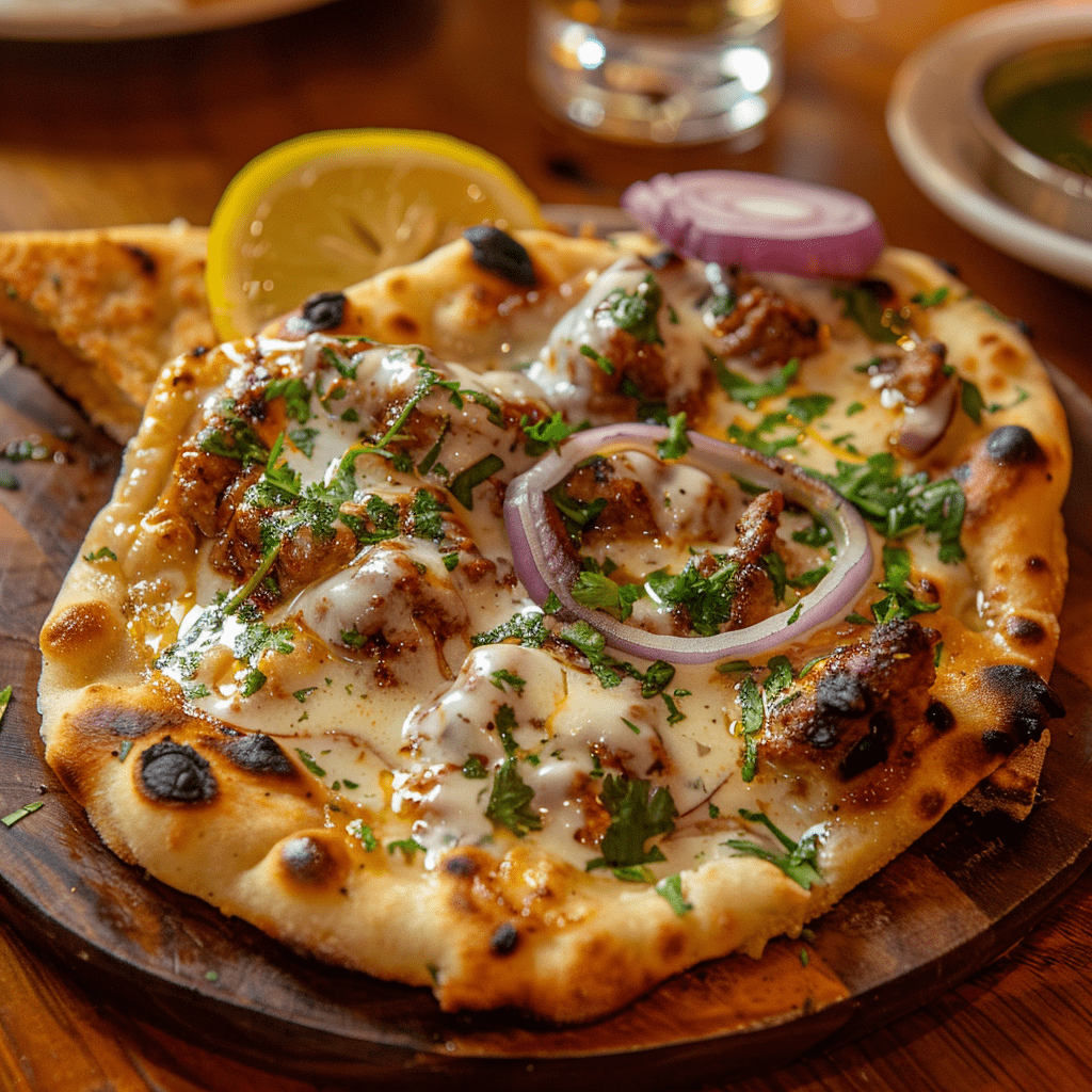 Poulet Tandoori en Cheese Naan avec sauce Indienne